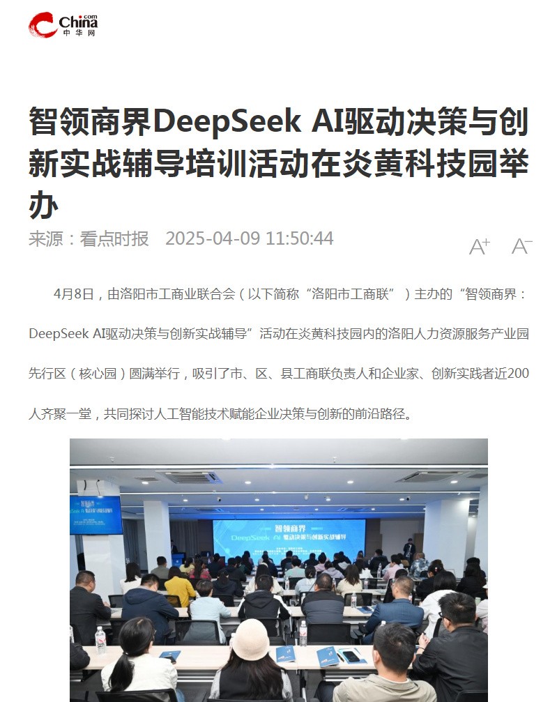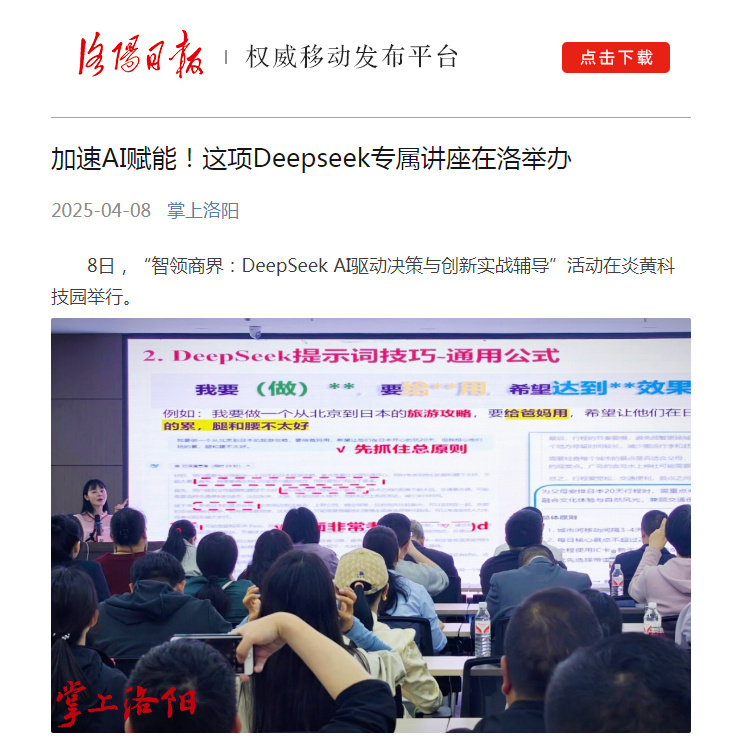 4月8日,“智領商界:DeepSeek AI驅動決策與創(chuàng)新實戰(zhàn)輔導”培訓活動在炎黃科技園舉行,轉發(fā)洛陽日報、中華網的相關報道——