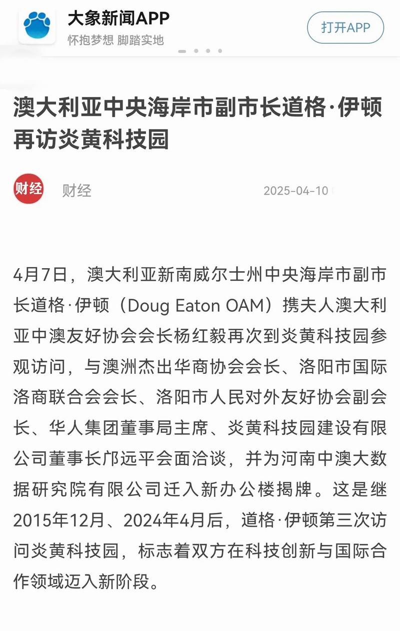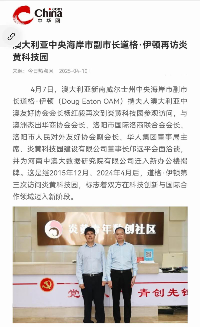 4月7日,澳大利亞新南威爾士州中央海岸市副市長(zhǎng)道格·伊頓(Doug Eaton OAM)攜夫人澳大利亞中澳友好協(xié)會(huì)會(huì)長(zhǎng)楊紅毅再次到炎黃科技園參觀(guān)訪(fǎng)問(wèn),與澳洲杰出華商協(xié)會(huì)會(huì)長(zhǎng)、洛陽(yáng)市國(guó)際洛商聯(lián)合會(huì)會(huì)長(zhǎng)、洛陽(yáng)市人民對(duì)外友好協(xié)會(huì)副會(huì)長(zhǎng)、華人集團(tuán)董事局主席、炎黃科技園建設(shè)有限公司董事長(zhǎng)鄺遠(yuǎn)平會(huì)面洽談,并為河南中澳大數(shù)據(jù)研究院有限公司遷入新辦公樓揭牌。這是繼2015年12月、2024年4月后,道格·伊頓第三次訪(fǎng)問(wèn)炎黃科技園,標(biāo)志著雙方在科技創(chuàng)新與國(guó)際合作領(lǐng)域邁入新階段。